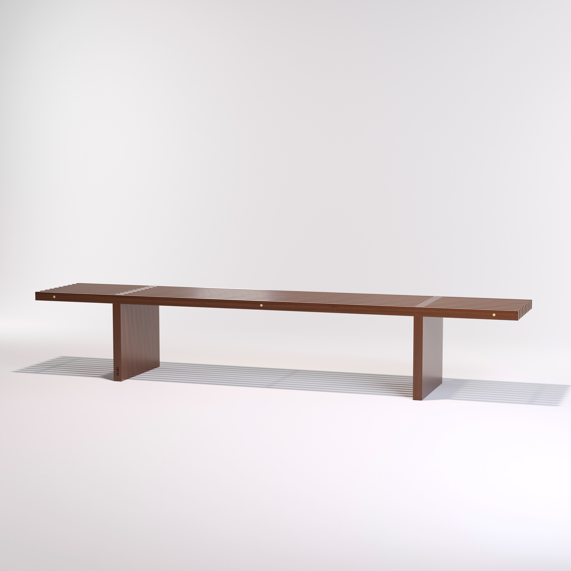 A peça é toda confeccionada em marcenaria tradicional e artesanal, valorizando os encaixes e principalmente a marcenaria japonesa. Todas as peças possuem a mesma largura mas os pés são colados e prensado, com vão intercalados para acomodar as ripas do assento. Cavilhas em marfim seguram a peça para que a madeira não empene com as variações de umidade. A peça foi inspirada no banco Tokyo, de Charlotte Perriand. O nome do banco da designer francesa é uma homenagem ao Japão, país onde ela morou durante alguns anos e aprendeu a trabalhar com madeira e encaixes. Após a finalização da montagem é utilizada uma fresa em todas as quinas para arredondar os cantos vivos.